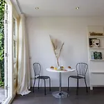 Værelserne har udsigt mod haven. Et badeværelse består af separat toilet og en bruser.